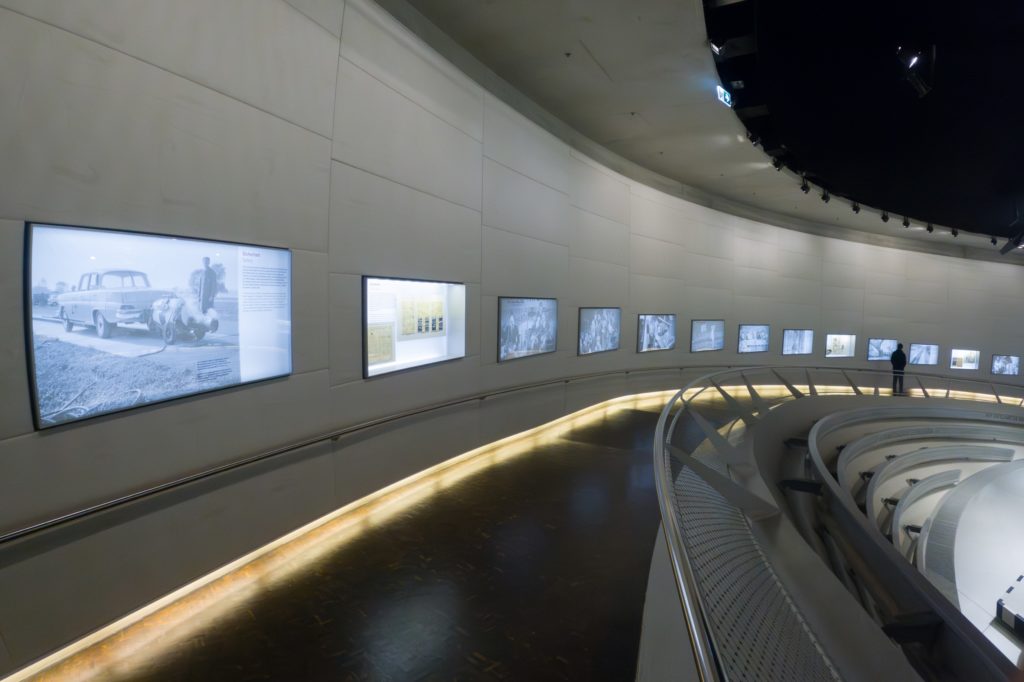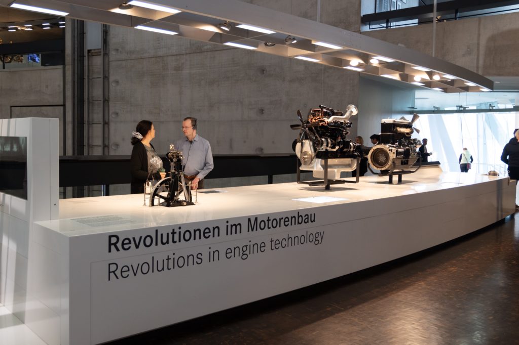 博物館内に入ると、高い天井とその奥行きにまず驚かされる。受付を済ませた後の、順路のスタートである最上階に向かうエレベーターは、さながら現代からゴットリープ・ダイムラーが三輪自動車を発明した1886 年へのタイムトラベルという趣き。最上階からは、各階にある年代ごとに分けられた6つのメイン展示室と、そのメイン展示室に付随するテーマ別展示室を順に巡りながら下の階へ降りていくことになる。最後の展示エリアには自動車史に燦然と輝くシルバーを基調とした数々のレーシングカーが所狭しと並べられている。各階の展示室を繋ぐスロープ部にはその時代の社会の動きも紹介され、展示車の社会的背景も理解する事ができる。