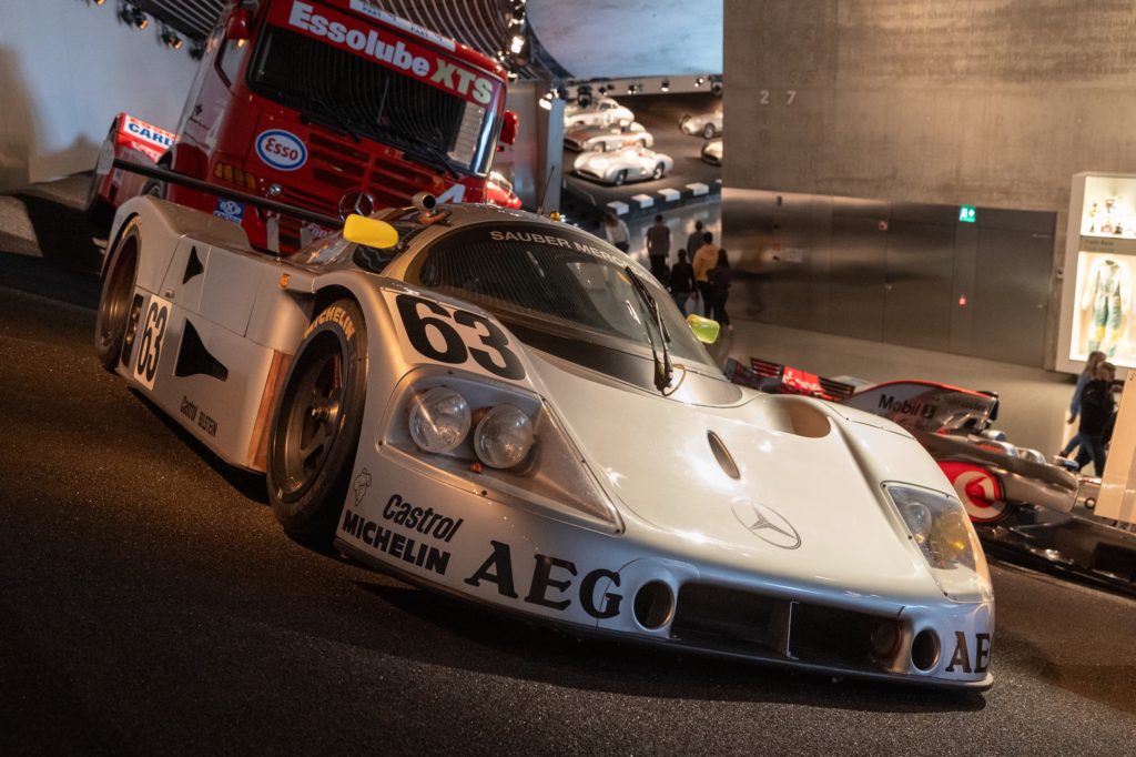 順路の最後はレーシングカーの展示エリアとなっている。F1からル・マン24時間レース、DTMといったレースを中心に、幅広いカテゴリーで歴史を名を刻んだシルバーアローと呼ばれたレーシングカーが並ぶ姿は壮観。メルセデス・ベンツのレーシングカーはレース参戦後に一般に売却されることが少ないため、貴重なマシンが多く並んでいる。レーシングカーを見終わると展示エリアから出ることになるが、ここで音声ガイドのストラップがお土産として渡されるので、忘れずに。